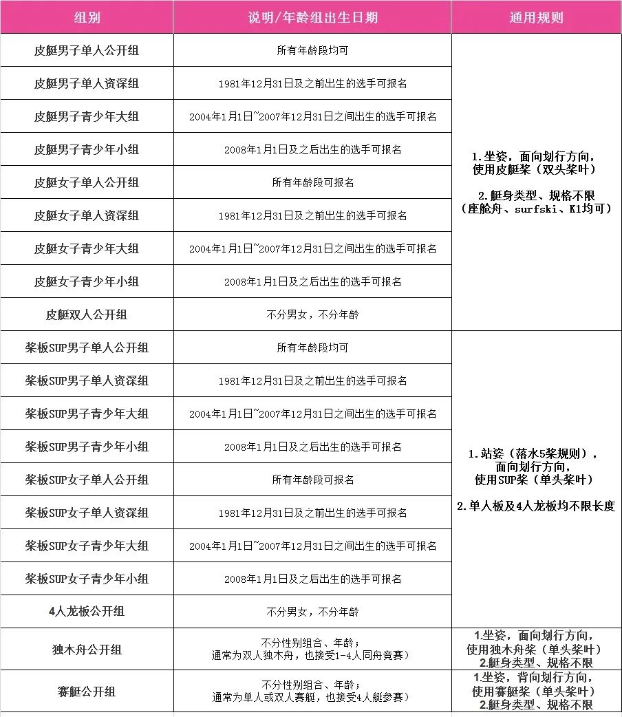 - 器材:皮划艇、桨板、独木舟、赛艇均可。器材自备。救生衣由赛点负责提供。